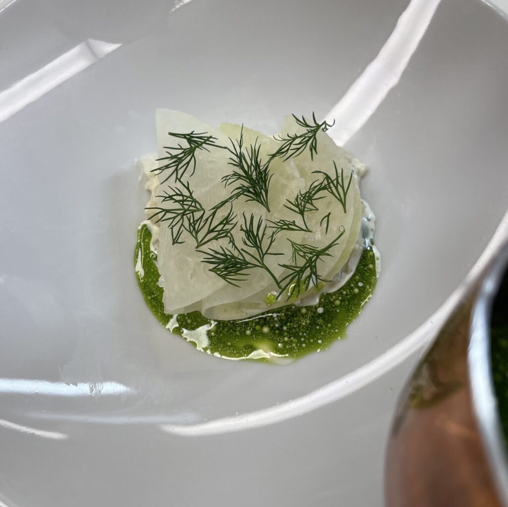 Kammusling tatar med creme fraiche, purløg, citron, syltede glaskål,